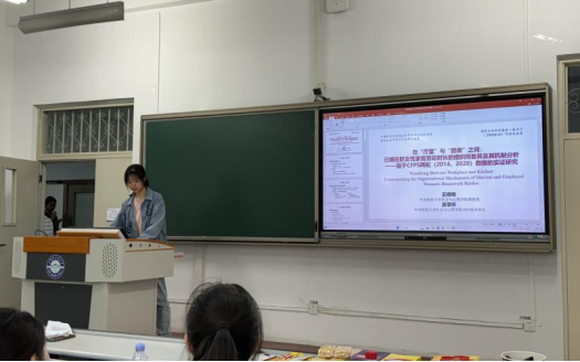 2021级本科生袁章伶同学分享了与王修晓副教授合作的研究,题为《在“厅堂”与“厨房”之间:已婚在职女性家务劳动时长的组织差异及其机制分析——基于CFPS两轮(2014、2020)数据的实证研究》。文章考察了工作单位对已婚女性家务劳动时长的影响,并检验了“体制庇护”和“观念传导”两条影响机制。本研究为已婚在职女性家务劳动参与的相关研究提供了一个具有“中国特色”的中观组织视角,为单位体制如何影响个体微观生活提供了可参考的解释机制,也为降低和消除家务劳动在体制内外及不同性别间存在的不平等提供了部分可操作的政策建议。